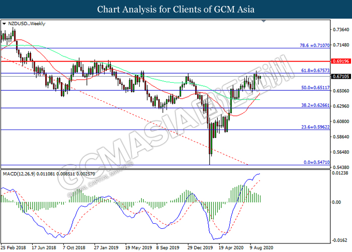 NZDUSD, Weekly: NZDUSD was traded higher while currently testing the resistance level at 0.6755. However, MACD which illustrated diminishing bullish momentum suggest the pair to be traded lower in short-term as technical correction.