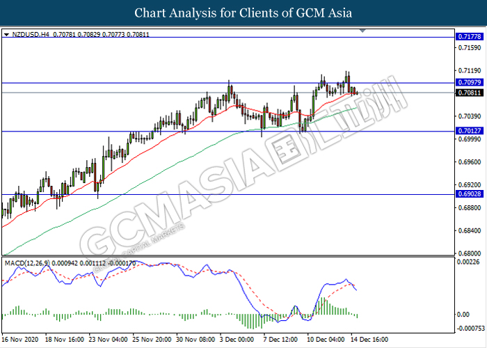 NZDUSD, H4: NZDUSD was traded lower following prior retracement from the resistance level 0.7095. MACD which illustrate bearish momentum signal with the formation of death cross suggest the pair to extend its retracement towards the support level 0.7010.