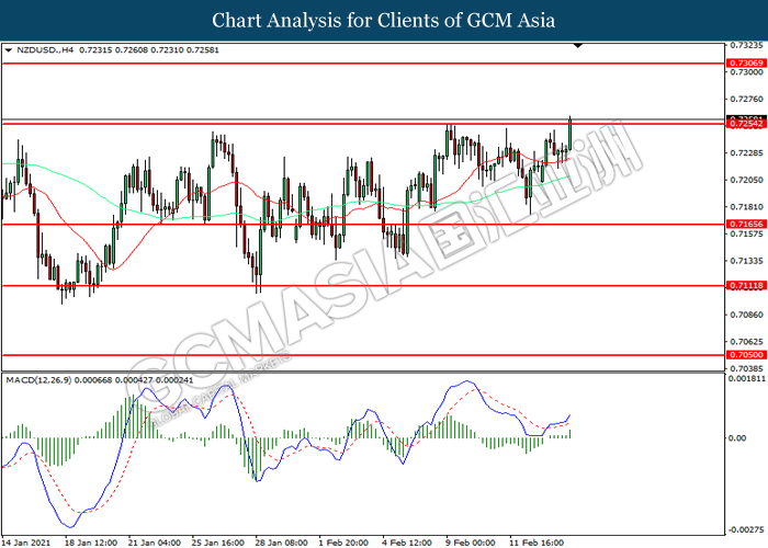 NZDUSD, H4: NZDUSD was traded higher while currently testing the resistance level at 0.7255. MACD which illustrated increasing bullish momentum suggest the pair to extend its gains after it successfully breakout above the resistance level.