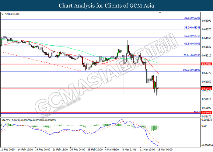 NZDUSD, H4: NZDUSD was traded lower while currently testing the support level at 0.6045. However, MACD which illustrated diminishing bearish momentum suggest the pair to be traded higher in short-term as technical correction.