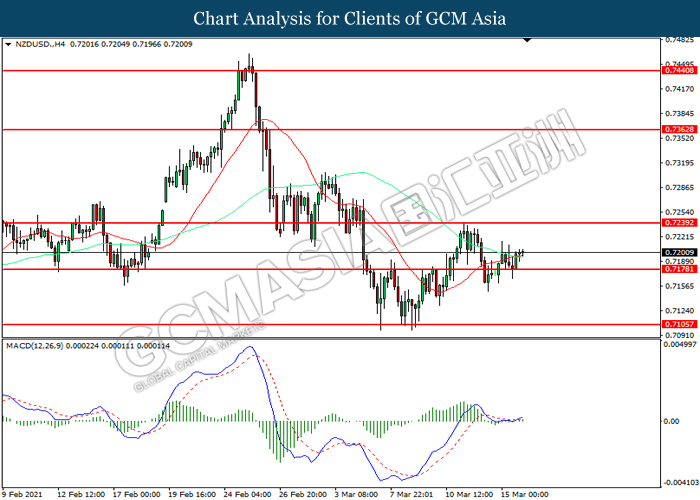 NZDUSD, H4: NZDUSD was traded higher following prior rebound from the support level at 0.7180. MACD which illustrated increasing bullish momentum suggest the pair to extend its gains toward resistance level at 0.7240.
