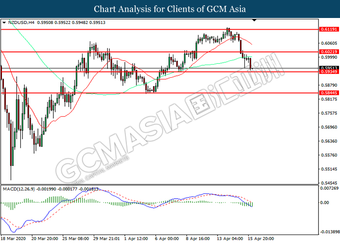 NZDUSD, H4: NZDUSD was traded lower while currently testing the support level at 0.5935. MACD which illustrated increasing bearish momentum suggest the pair to extend its losses after it successfully breakout below the support level.