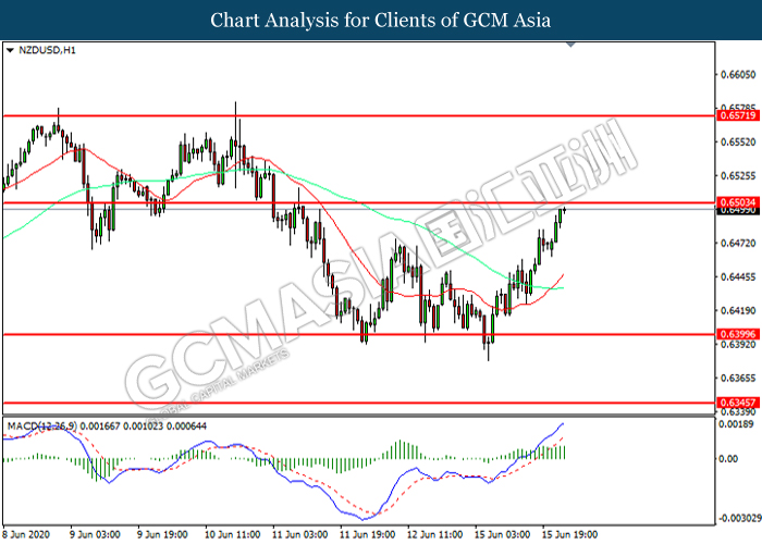 NZDUSD, H1: NZDUSD was traded higher while currently testing the resistance level at 0.6505. MACD which illustrated increasing bullish momentum suggest the pair to extend its gains after it successfully breakout above the resistance level.