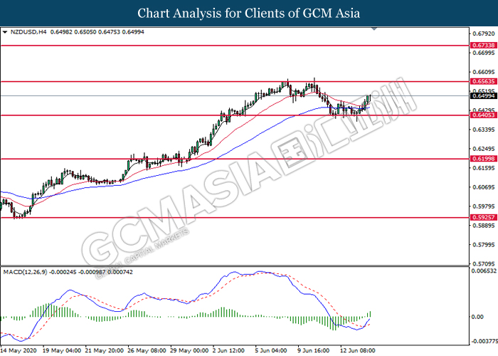 NZDUSD, H4: NZDUSD was traded higher following prior rebound from the support level at 0.6405. MACD which illustrate bullish bias momentum signal suggest the pair to extend its gains toward the resistance level at 0.6565.