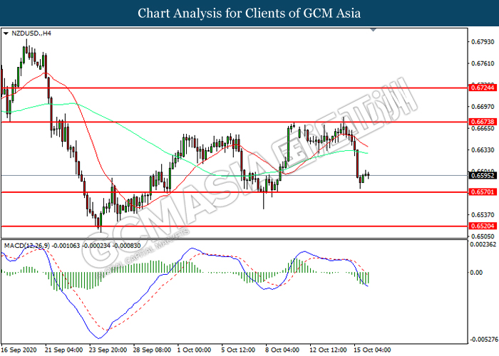 NZDUSD, H4: NZDUSD was traded higher following prior rebound from the support level at 0.6570. MACD which illustrated diminishing bearish momentum suggest the pair to extend its gains toward resistance level at 0.6675.