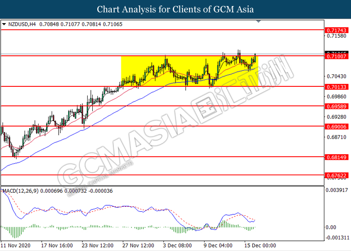 NZDUSD, H4: NZDUSD was traded higher while currently testing the resistance level at 0.7100. MACD which illustrated diminishing bearish momentum suggest the pair to extend its gains after it successfully breakout above the resistance level at 0.7100.