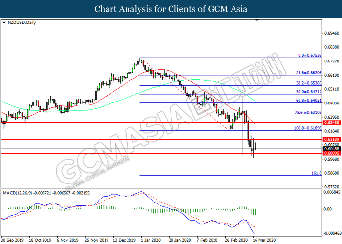 NZDUSD, Daily: NZDUSD was traded lower while currently testing the support level at 0.6010. MACD which illustrated increasing bearish momentum suggest the pair to extend its losses after it successfully breakout below the support level.