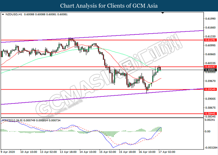 NZDUSD, H1: NZDUSD was traded lower following prior retracement from the resistance level at 0.6020. MACD which illustrated diminishing bullish momentum suggest the pair to extend its losses toward support level at 0.5935.