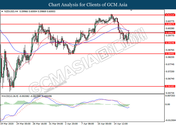 NZDUSD, H4: NZDUSD was traded higher while currently testing the resistance level at 0.5995. MACD which illustrate diminishing bearish momentum suggest the pair to extend its gains after it successfully breakout above the resistance level at 0.5995.