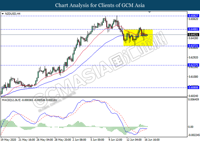 NZDUSD, H4: NZDUSD was traded flat in a sideway channel. However, MACD which illustrate bearish bias signal suggest the pair to be traded lower in short term towards the support level 0.6370.
