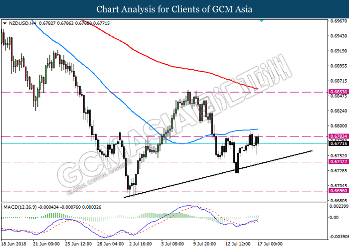 NZDUSD, H4: NZDUSD was traded higher while currently retest the resistance level of 0.6780. Recent price action and MACD which illustrate bullish signal with golden cross. However, a break above the resistance level is required for further confirmation.