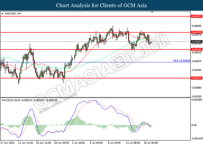 NZDUSD, H4: NZDUSD was traded lower following prior retracement from the resistance level at 0.6575. MACD which illustrated increasing bearish momentum suggest the pair to extend its losses toward support level at 0.6510.