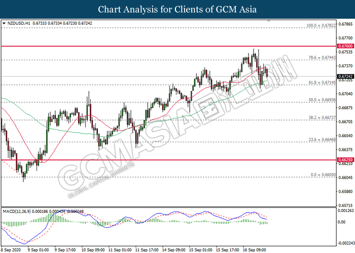 NZDUSD, H1: NZDUSD was traded lower following prior retrace from the higher level. MACD which illustrate bearish signal suggests the pair to be traded lower in short-term.
