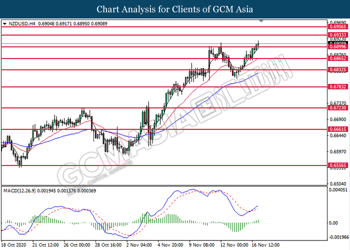 NZDUSD, H4: NZDUSD was traded higher following prior breakout above the previous resistance level at 0.6900. MACD which illustrate bullish bias momentum signal suggest the pair to extend its gains toward the resistance level at 0.6935.