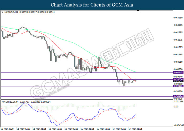 NZDUSD, H1: NZDUSD was traded within a range while currently testing the resistance level at 0.5965. MACD which illustrated increasing bullish momentum suggest the pair to be traded higher after it successfully breakout above the resistance level.