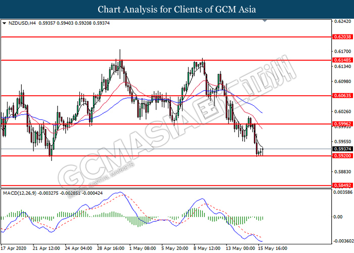 NZDUSD, H4: NZDUSD was traded higher following prior rebound from the support level at 0.5920. MACD which illustrates diminishing bearish momentum suggest the pair to extend its gains toward the resistance level at 0.5995.