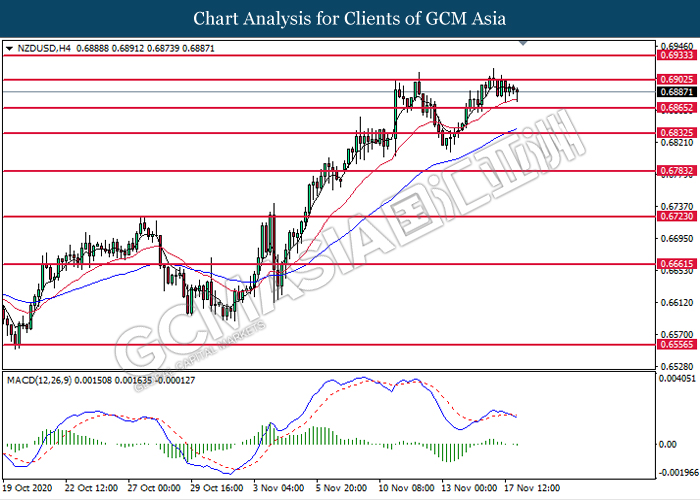 NZDUSD, H4: NZDUSD was traded lower following prior retracement from the resistance level at 0.6900. MACD which illustrate bearish momentum signal suggest the pair to extend its losses toward the support level at 0.6865.