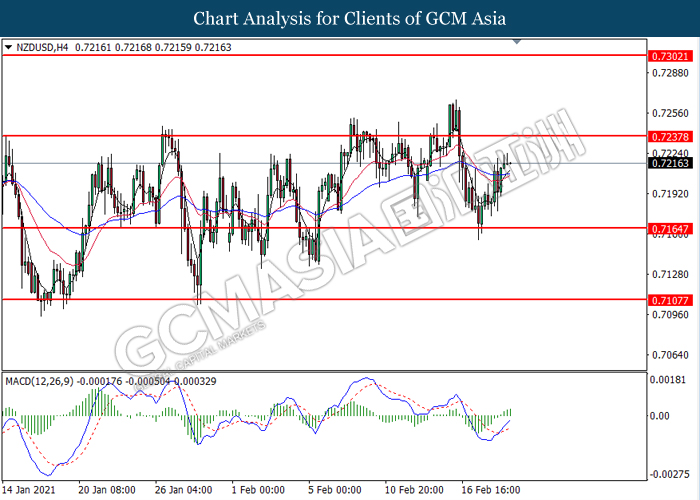 NZDUSD, H4: NZDUSD was traded higher following prior rebound from the support level at 0.7165. MACD which illustrated bullish bias momentum suggest the pair to extend its gains toward the resistance level at 0.7240.