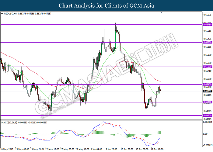 NZDUSD, H4: NZDUSD was traded lower following prior retracement from the resistance level 0.6540. MACD which illustrate diminishing bullish momentum suggest the pair to extend its losses after successfully closing below the 20-MA line (green).
