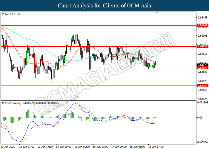 NZDUSD, H1: NZDUSD was traded lower while currently testing the support level at 0.6420. However, MACD which illustrated diminishing bearish momentum suggest the pair to be traded higher in short-term as technical correction.