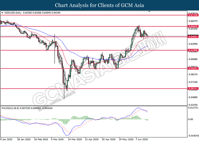 NZDUSD, Daily: NZDUSD was traded lower while currently testing the support level at 0.6405. MACD which illustrate bearish bias momentum signal suggest the pair to extend its losses after it successfully breakout below the support level at 0.6405.
