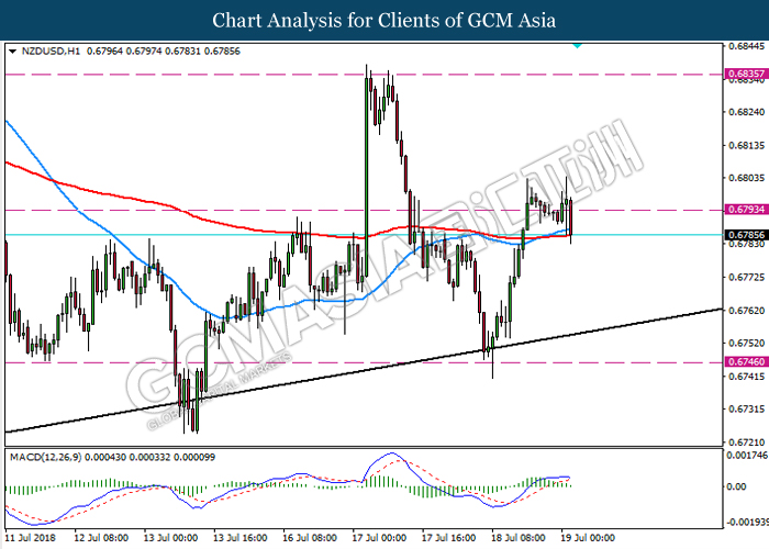 NZDUSD, H1: NZDUSD was traded lower while currently retest the resistance level 0.67934. Both indicators MA lines and MACD which display bullish bias with golden cross formation suggest the pair could extend its gains after a breakout above the resistance level 0.6790.