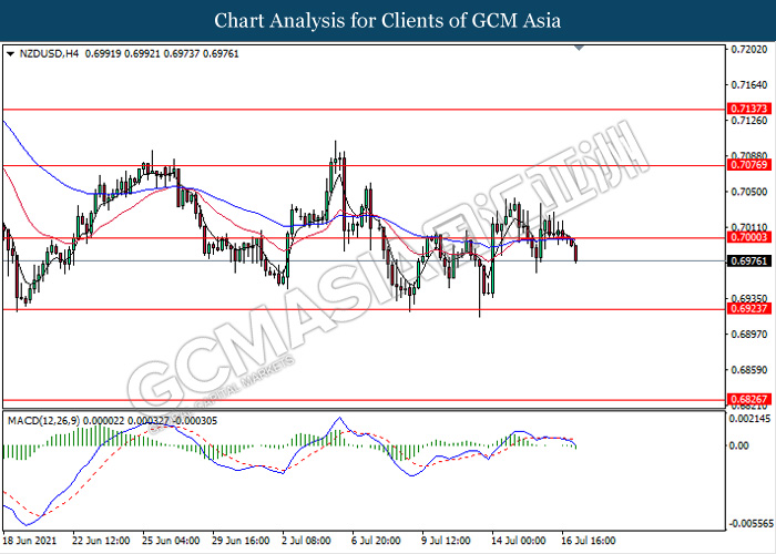 NZDUSD, H4: NZDUSD was traded lower following prior breakout below the previous support level 0.7000. MACD which illustrate bearish momentum signals suggest the pair to extend its losses towards the support level 0.6925.