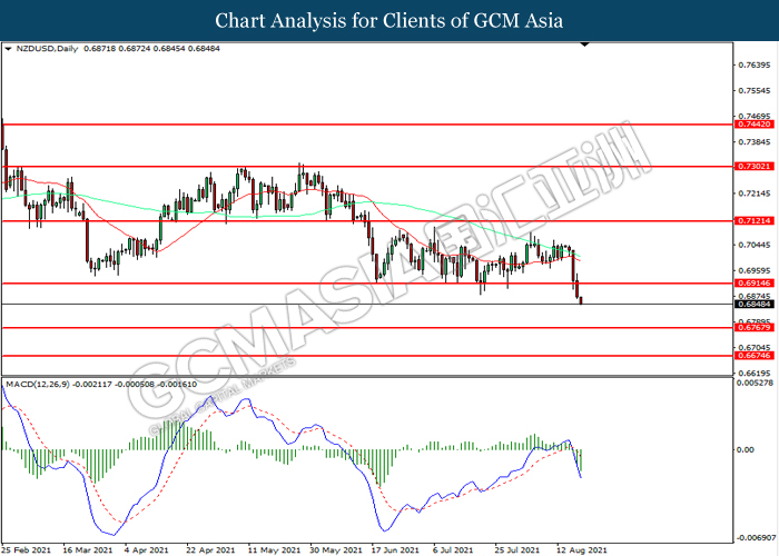NZDUSD, Daily: NZDUSD was traded lower following prior breakout below the previous support level at 0.6915. MACD which illustrated increasing bearish momentum suggest the pair to extend it losses toward support level at 0.6770.