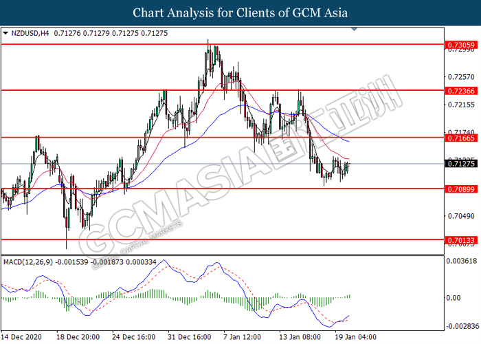 NZDUSD, H4: NZDUSD was traded higher following prior rebound from the lower level. MACD which illustrated bullish bias momentum suggest the pair to extend its gains toward the resistance level at 0.7165.