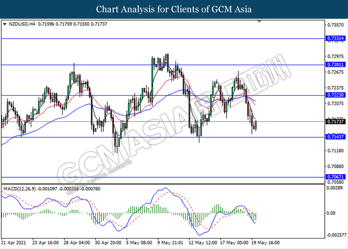 NZDUSD, H4: NZDUSD was traded lower while currently testing near the support level 0.7145. MACD which illustrate bearish momentum signal with the formation of death cross suggest the pair to extend its losses after it breaks below the support level.