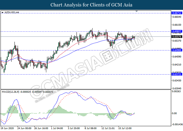 NZDUSD, H4: NZDUSD was traded higher following prior rebound from the MA lines. MACD which illustrate bullish bias signal with the starting formation of golden cross suggest the pair to extend its rebound in short term towards the resistance level 0.6580.