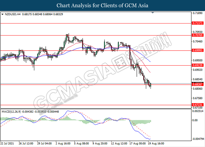NZDUSD, H4: NZDUSD was traded lower while currently testing the support level 0.6825. However, MACD which illustrate diminishing bearish momentum signal suggest the pair to be traded higher as a technical correction towards the resistance level 0.6925.