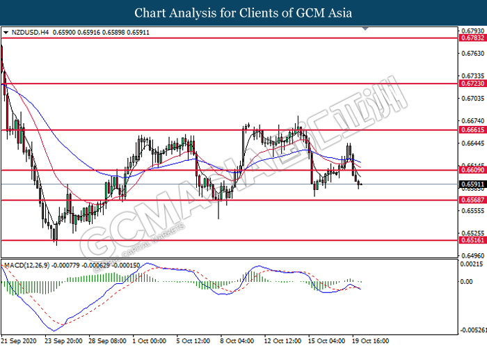 NZDUSD, H4: NZDUSD was traded lower following prior breakout below the previous support level at 0.6610. MACD which illustrate bearish momentum signal suggest the pair to extend its losses toward the support level at 0.6570.