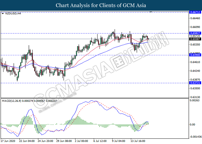 NZDUSD, H4: NZDUSD was traded lower following prior retracement from the resistance level 0.6580. MACD which illustrate diminishing bullish bias signal suggest the pair to extend its retracement towards the support level 0.6490.