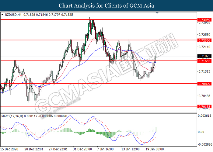 NZDUSD, H4: NZDUSD was traded higher following prior breakout above the previous resistance level at 0.7165. MACD which illustrated bullish bias momentum suggest the pair to extend its gains toward the resistance level at 0.7235.