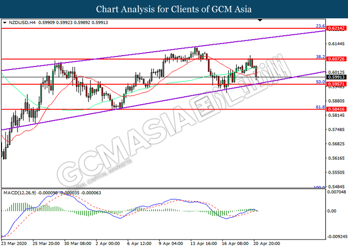 NZDUSD, H4: NZDUSD was traded lower following prior retracement from the resistance level at 0.6075. MACD which illustrated diminishing bullish momentum suggest the pair to extend its losses toward support level at 0.5955.