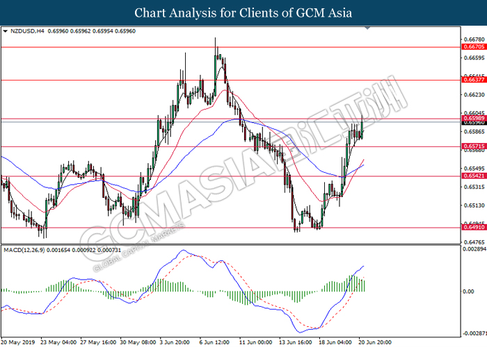 NZDUSD, H4: NZDUSD was traded higher while currently testing the resistance level at 0.6600. MACD which illustrate bullish signal suggest the pair to extend its gains after successfully closing above the resistance level at 0.6600.