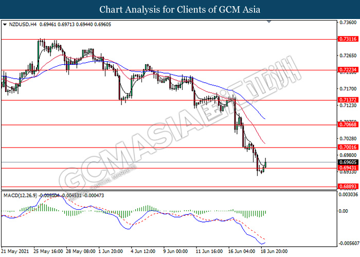 USDCAD, H4: USDCAD was traded higher following recent breakout above the previous resistance level 1.2420. However, MACD which illustrate diminishing bullish momentum signal suggest the pair to experience a technical correction in short term back towards the level 1.2420.