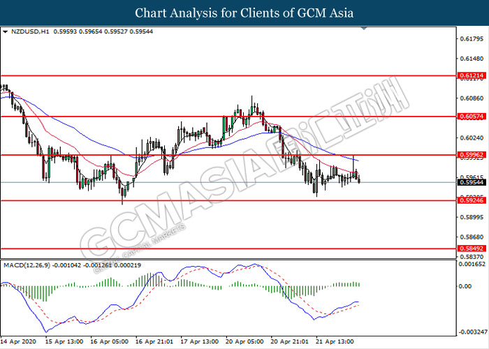 NZDUSD, H1: NZDUSD was traded lower following prior retracement from the resistance level at 0.5995. MACD which illustrate diminishing bullish momentum suggest the pair to extend its losses toward the support level at 0.5925.
