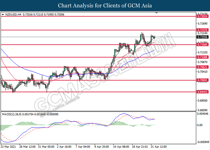 NZDUSD, Daily: NZDUSD was traded higher following prior rebound from the support level at 0.7170. MACD which illustrated bullish bias momentum signal suggests the pair to extend its gains toward the resistance level at 0.7235.