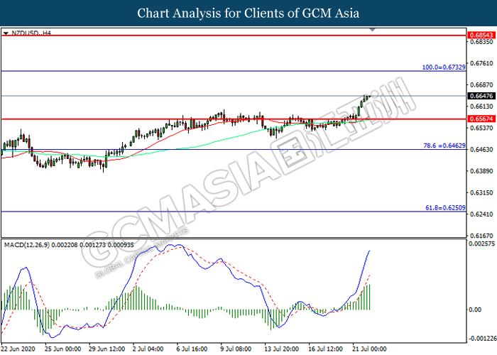 NZDUSD, H4: NZDUSD was traded higher following prior breakout above the previous resistance level at 0.6565. MACD which illustrated increasing bullish momentum suggest the pair to extend its gains toward resistance level at 0.6735.