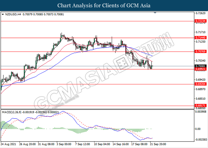 NZDUSD, H4: NZDUSD was traded lower while currently testing near the support level 0.6990. However, MACD which illustrate bullish bias signal with the formation of golden cross suggest the pair to be traded higher towards the resistance level 0.7075.