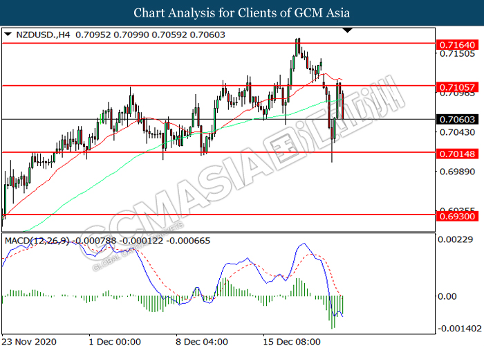 NZDUSD, H4: NZDUSD was traded lower following prior retracement from the resistance level 0.7105. However, MACD which illustrated diminishing bearish momentum suggest the pair to be traded higher in short-term as technical correction.