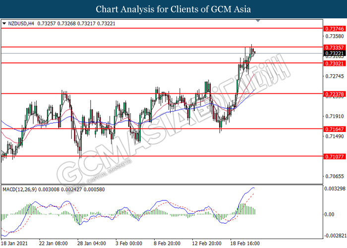 NZDUSD, H4: NZDUSD was traded lower following prior retracement from the resistance level at 0.7335. MACD which illustrated diminishing bullish momentum suggest the pair to extend its losses toward the support level at 0.7300.