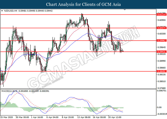 NZDUSD, H4: NZDUSD was traded lower while currently testing the support level at 0.5945. MACD which illustrate bearish bias momentum suggest the pair to extend its losses after it successfully breakout below the support level.