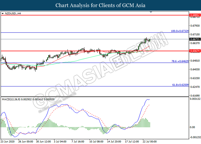 NZDUSD, H4: NZDUSD was traded higher following prior breakout above the previous resistance level at 0.6565. However, MACD which illustrated diminishing bullish momentum suggest the pair to be traded lower in short-term as technical correction.