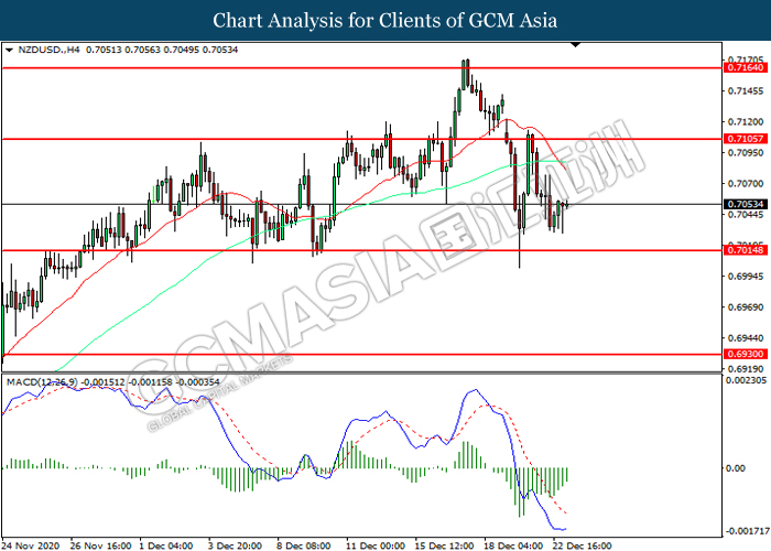 NZDUSD, H4: NZDUSD was traded lower following prior retracement from the resistance level 0.7105. However, MACD which illustrated diminishing bearish momentum suggest the pair to be traded higher in short-term as technical correction.