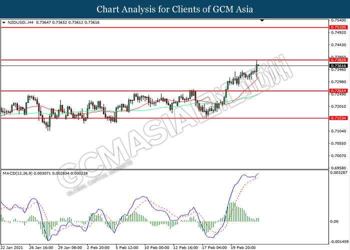 NZDUSD, H4: NZDUSD was traded higher while currently testing the resistance level at 0.7385. MACD which illustrated increasing bullish momentum suggest the pair to extend its gains after it successfully breakout its resistance level.