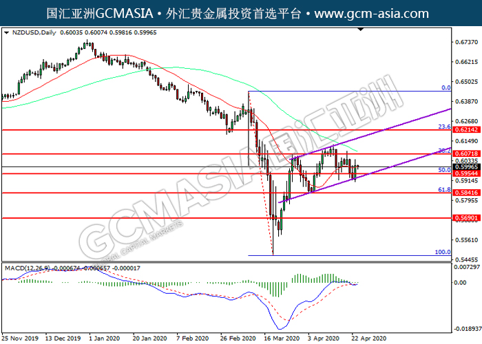 NZDUSD, Daily: NZDUSD was traded higher following prior rebound from the support level at 0.5955. However, MACD which illustrated diminishing bullish momentum suggest the pair to be traded lower in short-term as technical correction.
