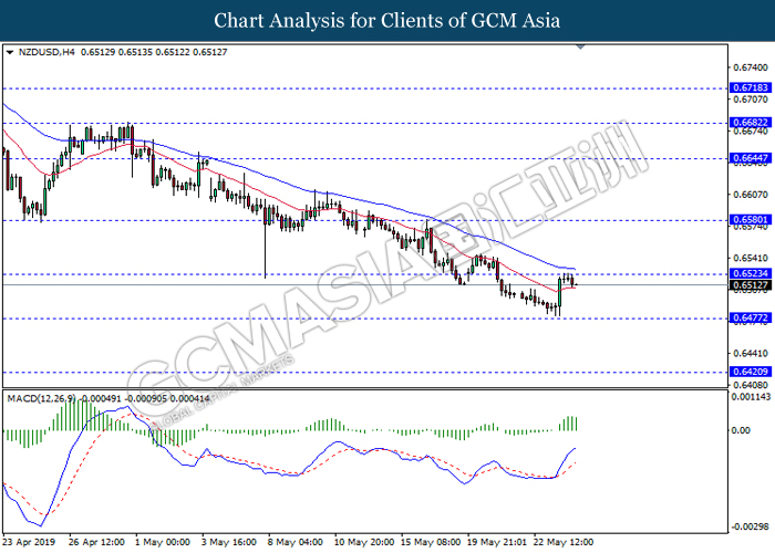 NZDUSD, H4: NZDUSD was traded lower following prior retracement from the resistance level 0.6525. MACD which illustrate diminishing bullish momentum suggest the pair to extend its retracement towards the support level 0.6475.